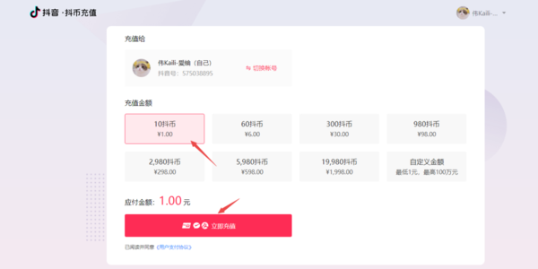 接着,电脑浏览器就会进入到抖音的抖币充值界面了,此时我们选择想要充值的选项,最后点击【立即充值】并进行支付即可。