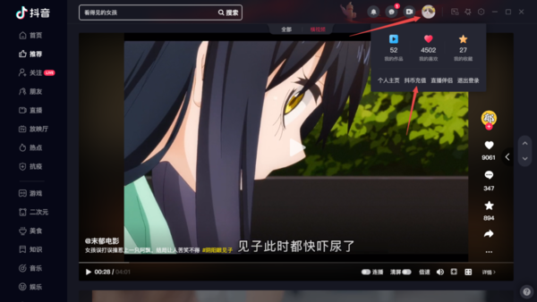 根据财神爷站小编的亲自使用经验来看,电脑版抖音充值抖币的位置非常好找,我们只需要点击【个人头像】图标,就可以在下方看到【抖币充值】的选项,点击它。