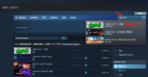 第二步,我们可以看到右上方有搜索栏,我们在搜索栏上输入【极品飞车】、【need?for?speed】等关键字,会在下方弹出【极品飞车:不羁】,点击即可直接跳转到极品飞车22商品界面。