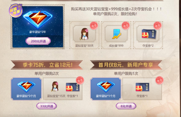 优惠一:月度/季度/2年豪华蓝钻价格分别为8元/33元/200元,均有很大幅度的优惠,其中2年豪华蓝钻打55折,立省160元,并且还送蓝钻宝宝、成长值等,超级划算。