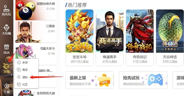 1、在进入QQ游戏大厅主界面之后,将鼠标划到左侧功能栏的【发现】,然后会弹出扩展,我们点击其中的【蓝钻】,进入蓝钻界面。