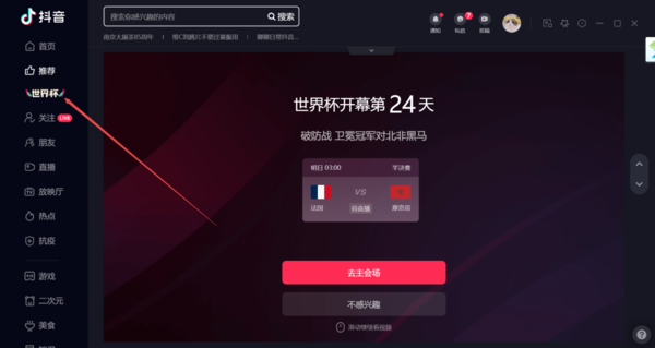 1、启动电脑端抖音软件,点击【世界杯】频道。