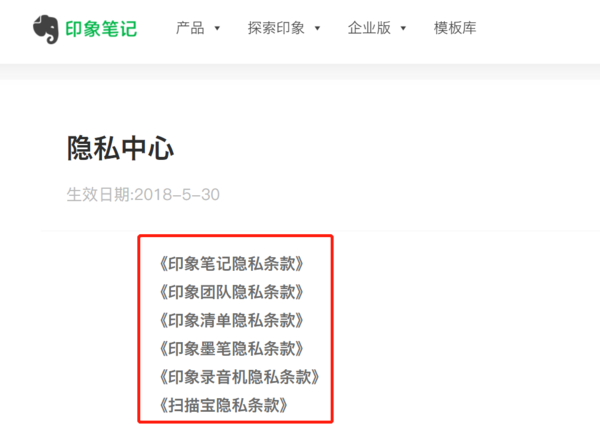 在印象笔记官网的“隐私中心”介绍中,关于用户的隐私条款就多达6条。