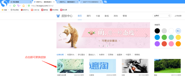 在皮肤界面,我们可以直接浏览到若干款皮肤,对于自己喜欢的皮肤,我们可以直接点击皮肤图片,届时搜狗浏览器直接帮我们换上目标皮肤,非常轻松、非常方便。