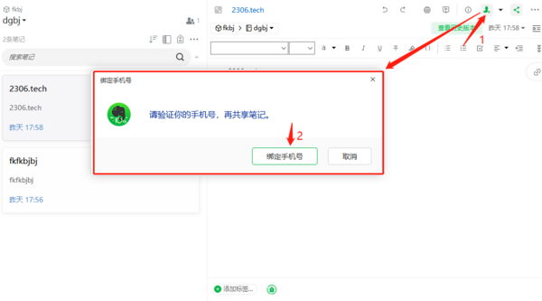 之后会有短信验证环节,我们成功验证后,手机号将与印象笔记号绑定,我们即可正常使用印象笔记的共享笔记功能。