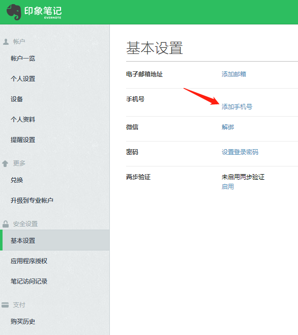 2、为账号绑定手机号。如果我们刚注册完印象笔记账号,或是之前注册的账号并没有绑定手机号;那么我们需要再给印象笔记账号绑定手机号;绑定完成后,即可使用印象笔记的共享功能,从而轻松实现笔记协作。