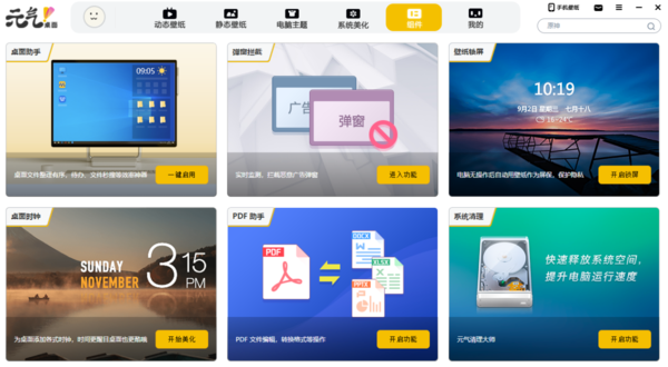 3、系统组件。元气桌面还支持桌面整理、弹窗拦截、锁屏设定、桌面时钟等功能,让你的电脑更加智能、更加人性化。