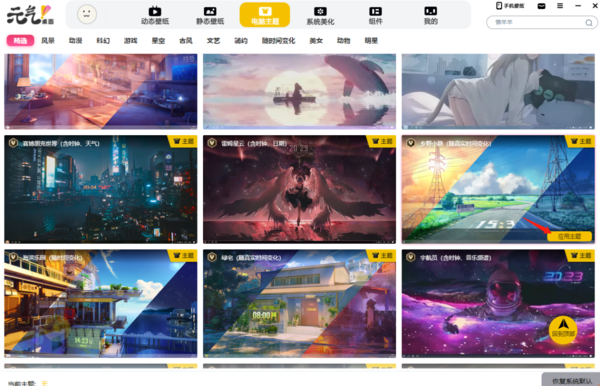 1、电脑主题。与动/静态桌面不同只是改变电脑墙纸不同,元气桌面的动态桌面会将电脑的墙纸、任务栏等元素均进行更改,让我们眼前焕然一新;而且,元气桌面中有静谧风、动态风、酷炫风等风格的主题等你来探索。