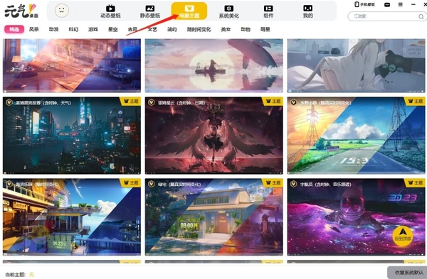 1、首先,我们打开元气桌面,在其主界面上,点击上方模块栏中的【电脑主题】,进入主题界面。