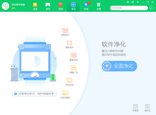 360旗下评分超高超好用的软件二是360软件管家,评分:★★★★★,它是一款集软件下载、安装、更新等功能于一身的管理软件。再加上软件净化功能的加持,日常软件使用更加纯净。