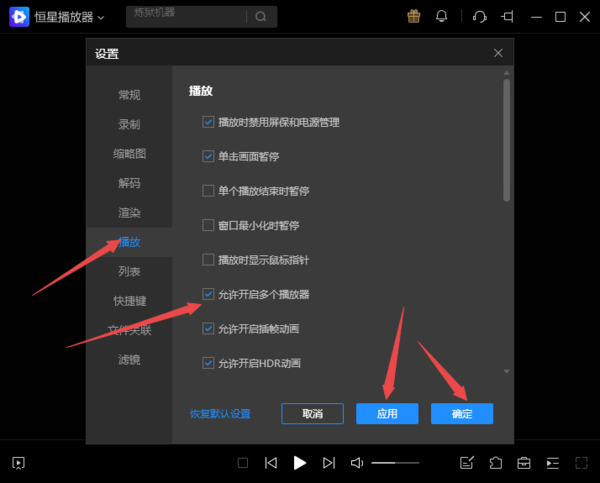 二、进入到软件的设置窗口当中后,找到左侧列表中的【播放】选择并点击它,然后在右侧的界面中,找到【允许开启多个播放器】选项,并勾选它,然后点击【应用】按钮,接着再点击【确定】按钮。