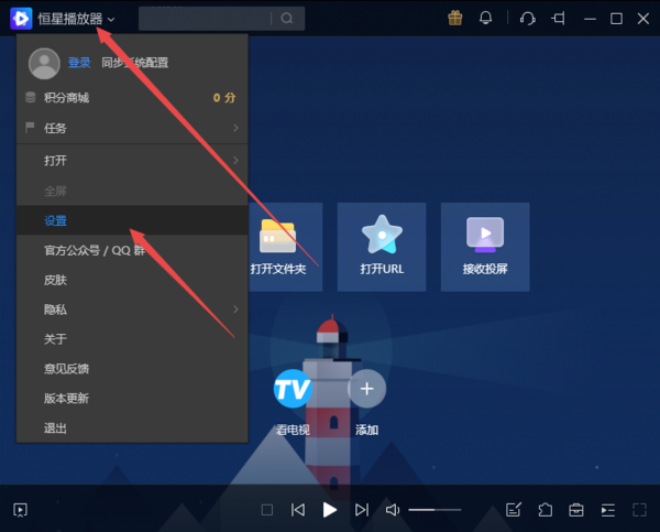 一、启动电脑上的恒星播放器,然后点击左上角的【恒星播放器】,在弹出的选项中选择【设置】选项。