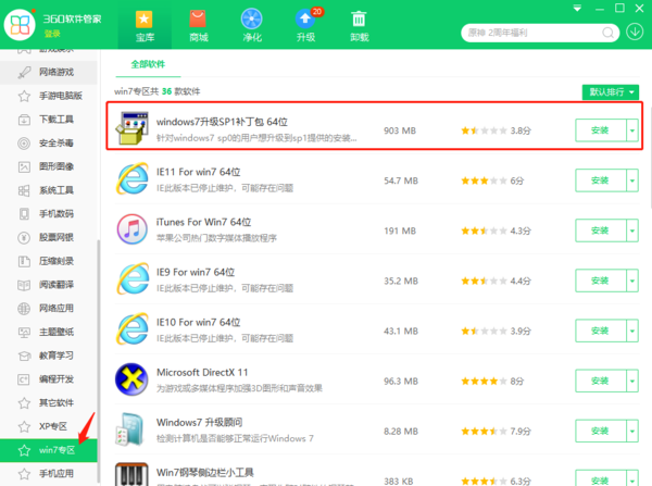 在360软件管家的【win7软件】版块中,我们可以找到win7升级SP1补丁包,利用该软件我们就可以升级win7系统;由此可见360软件管家的功能还是很丰富的。