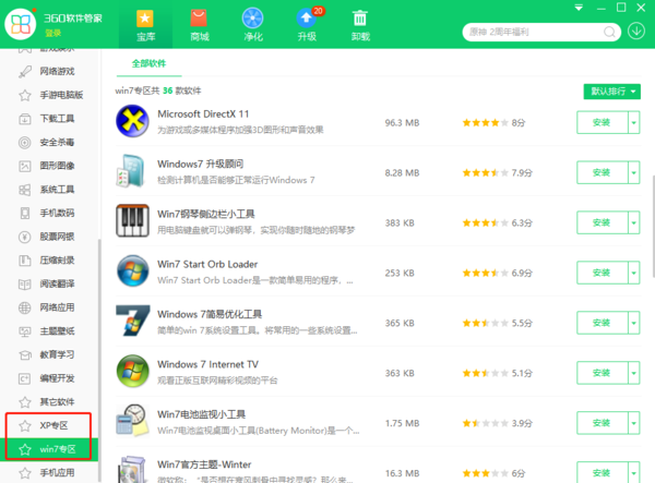 我们不仅在浏览360软件管家的库中,可以找到若干win7软件;而且360软件管家还单独开设了【win7软件】、【XP软件】版块,里面仅有对应分类的软件,更加方便XP、win7用户去寻找适合自己的软件。