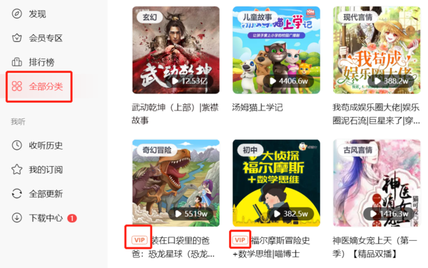 最后还有一个好方法可以快速找到非会员的免费书籍,我们点击左侧菜单列表的“全部分类”,在右侧我们可以看到有许多的细分书籍,每一部作品都配有一张封面和书名标题,如果在标题的左侧没有“VIP”图示,这部作品就可以免费听了。