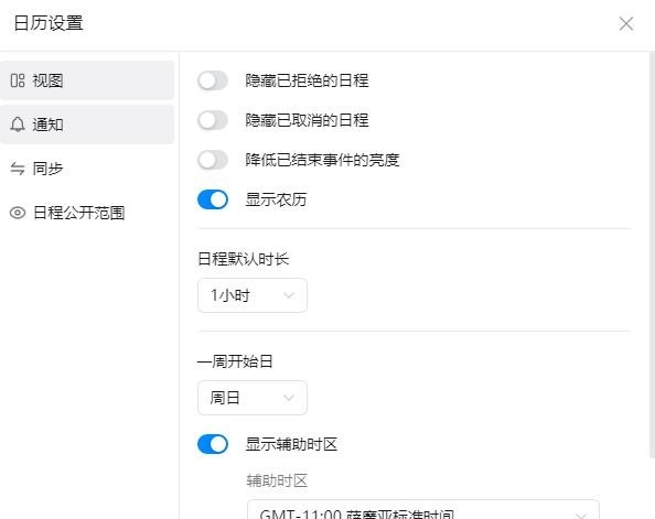 在这里,我们可以设置在日历中隐藏已拒绝、取消的日程;降低已完成事件的亮度;显示农历;以及调日程默认时长及一周开始日等属性;对于有与国际接轨工作需求的朋友,这里还能调整显示辅助时区,以让我们的工作更方便。