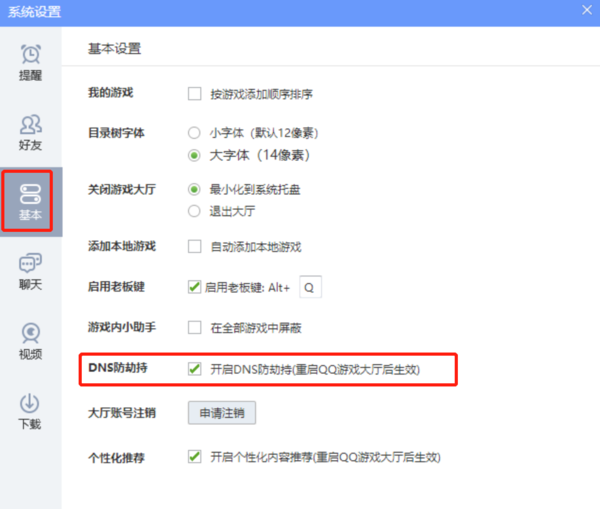 8、打开QQ游戏大厅右上角的设置——【基本】——勾选【开启DNS防劫持】。