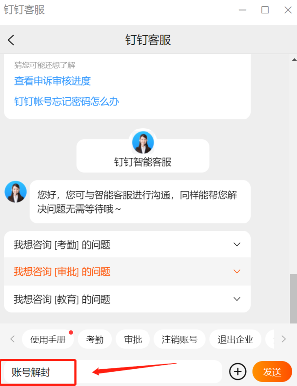 3、在弹出的钉钉客服中,我们在聊天栏内输入【账号解封】,点击【立即申诉】即可申请。
