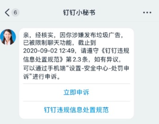 1、在群内发送了敏感信息,违反了《钉钉违规信息处置规范》,被钉钉官方封禁了。