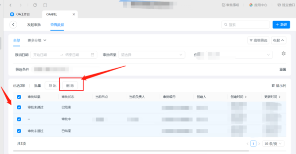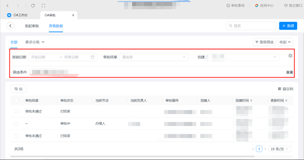 1.?我们从电脑端钉钉工作台进入OA审批,点击需要操作的表单,点击【查看数据】,可设置筛选条件,查询需要删除的数据,例如按照表单发起人筛选,需搜索【创建人】;