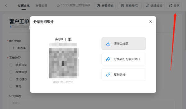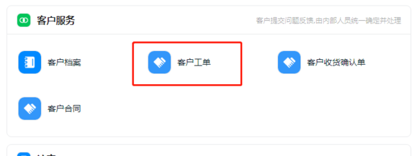 1.内部人员点击客户服务中的【客户工单】,点击右上角【分享】将【客户工单】分享给外部人员;