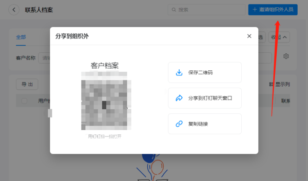 2.在联系人档案页面,点击渔鸥上架【邀请组织外人员】,我们可通过发送二维码、分享到钉钉、复制链接的方式邀请外部人员填写档案;
