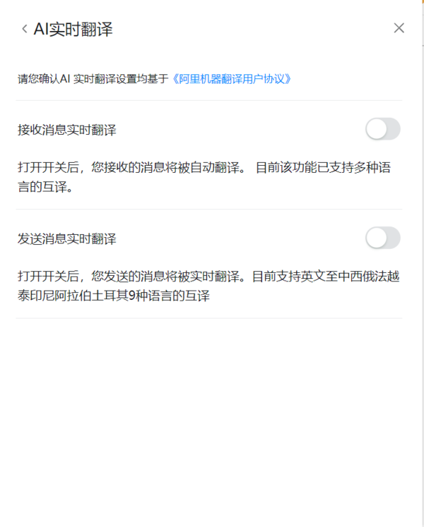如果你经常使用钉钉又经常与外国友人使用钉钉交流,那么实时AI翻译功能是你不可多得的得力助手,在对话聊天窗口的【小齿轮】按钮处点击【AI实时翻译】打开后即可在聊天窗口实时翻译国外文字。