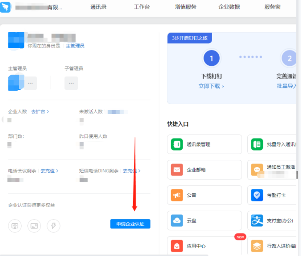 我们在浏览器中输入【oa.dingtalk.com】,进入管理后台-下拉找到【申请企业认证】,如下图