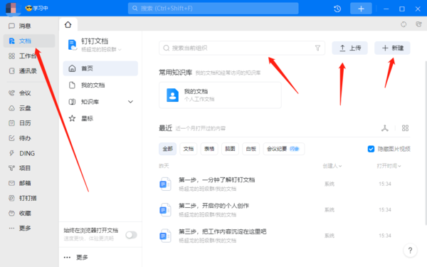 在钉钉主界面点击左侧【文档】,在【搜索组织】搜索框中找到需要上传文档的组织。点击【上传】或【新建】,上传即可。