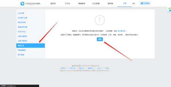 2.电脑端钉钉后台点击解散企业,企业将立即解散;而手机端的钉钉确认解散企业后会进入解散流程,系统三天后自动解散企业,三天内管理员可撤销解散操作。