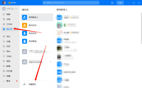1.?我们在钉钉主界面,找到左侧【通讯录】选项,点击页面下方的【创建团队】;