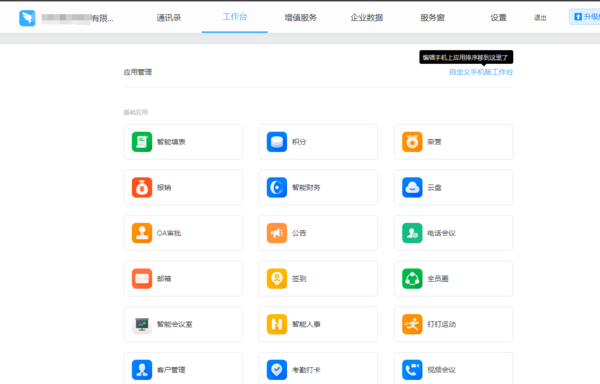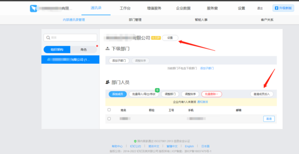 3.?创建完成之后,我们页面会跳转如图所示页面,在此是我们的企业后台了,我们可以在此处添加部门,邀请成员,设置角色,管理员等等,并且可以设置【工作台】,添加【签到】、【考勤打卡】等等应用。