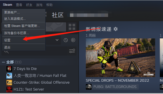 1.?我们打开steam客户端并登陆,来到主界面点击左上角【steam】,会出现菜单选项,,选择【设置】;