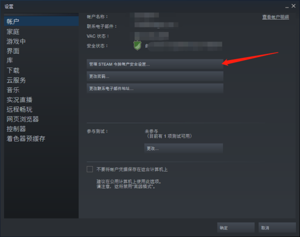 2.?在左侧【账户】一栏中,选择【管理steam令牌账户安全设置】;