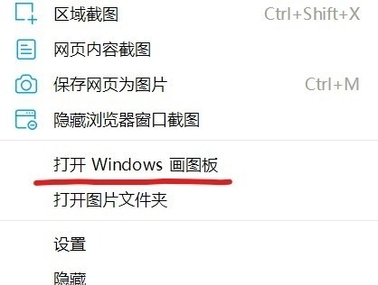 我们在浏览器界面上方的小剪子图标处旁边点下拉菜单,在下拉菜单中点击打开Windows画图板将其调出。