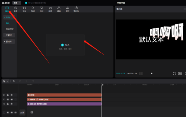 我们选中素材想要添加文字的文职,点击左上角【添加文本】即可。添加的文字在播放器中可调整字体格式、大小等等,文字播放长度也可以在轨道中拖动来控制。