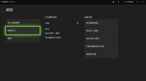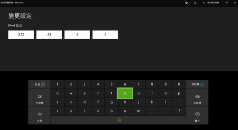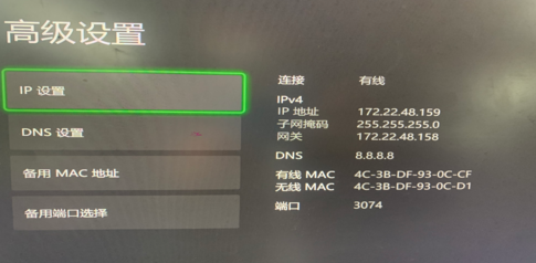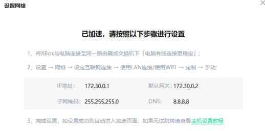 3.?接下来是Xbox的设置,点击控制器中间的Xbox键,然后选择设置->网络->网络设定->进阶设定,之后设置ip,按照上面加速成功后给出的数据设置ip、掩码和网关。之后设定DNS,主要IPv4?DNS输入8.8.8.8,次要IPv4?DNS输入0.0.0.0。完成后一切正常就可以愉快的游戏了。
