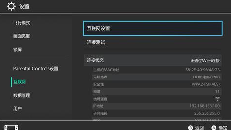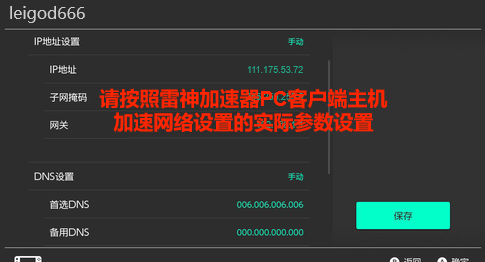 3.?Switch设置,选择对应网络,并点击更改设置,将IP地址、子网掩码、网关和DNS改为上面雷神加速器提供的配置,注意,如果不够三位,前面需要补0,完成后返回网络测试,显示连接成功即可游戏了。