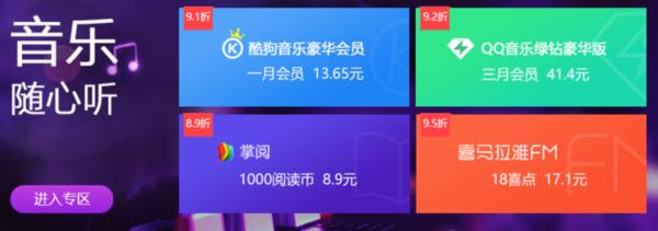 (3)音乐畅听区:酷狗、QQ音乐、掌阅、喜马拉雅、懒人听书会员享超低优惠。