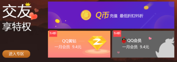 (2)交友社交区:QQ会员、QQ币、QQ钻、知乎、哔哩哔哩、饿了么、百度文库、Keep等社交软件的增值服务,也可享超值优惠。