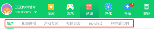 1、点击软件界面上方【商城】即可开启查看360软件管家带来的劲省福利。