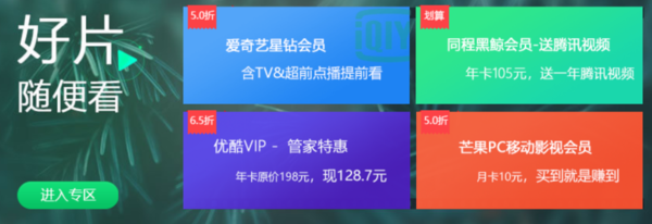 (1)视频软件区:爱奇艺、腾讯视频、优酷、搜狐视频、芒果、酷喵,以上会员最低可享五折优惠。