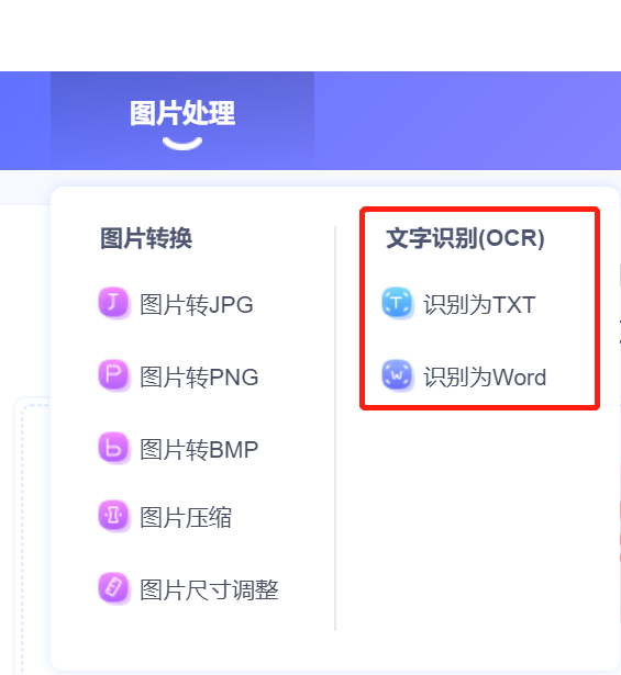 3、之后我们点击页面上方的【图片处理】,根据需求选择文字导出方式为TXT还是word。