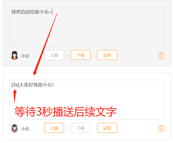 2、此时我们会看到界面中已经有两位智能语音主播在列,因为是双人对话,如果你已经写完稿子了的话,每个人所要说的话应该都已经编排完毕了,我们可以先将对话文本粘贴到各自对应的角色当中。