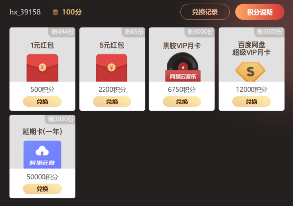 恒星播放器的积分可以兑换微信现金红包,网易云音乐黑胶VIP会员、百度网盘超级VIP月卡、阿里云盘延期卡。
