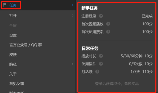 2、登录后我们就要先了解一下积分的获取方式,同样我们还是先打开左上角的下拉菜单,并选择【任务】,在其中我们可以看到恒星播放器获取积分的详细规则,分为一次性任务和日常任务,一次性任务都非常简单,做完就可拿100积分,日常任务就需要我们日积月累的完成来增加积分啦。