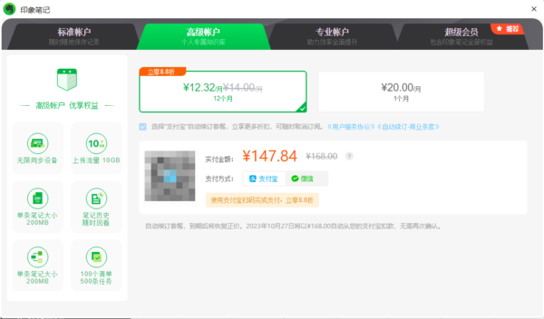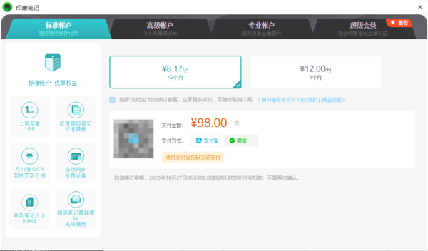 最后,印象笔记高级账户与标准账户的差异还有价格方面,其中高级账户12个月的价格为168元,1个月的价格为20元。而标准账户12个月的价格为98元,1个月的价格为12元。