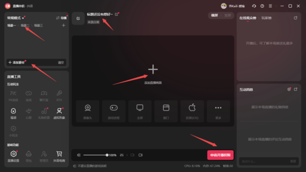 第五步,紧接着在打开的直播界面上,根据自己的需求,设置好直播相关的【标题】、【场景模式】、【素材】、【直播画面】等参数,最后点击【申请开通直播】按钮即可。不过这里需要注意的是,账号最少要有1000粉丝才能够开通直播权限哦。
