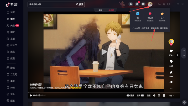 第一步,打开电脑上的抖音,然后登录自己的账号,接着点击【个人头像】,找到【直播伴侣】选项,点击它。