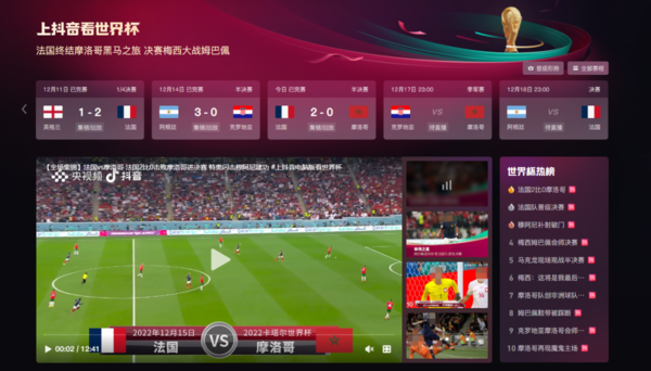 如果大家想在18日晚,第一时间锁定2022世界杯直播,那可以使用抖音电脑版。因为在这款软件中,我们可以享受4k高清看球,多机位观赛,对于比赛的情况我们可以尽收眼底。另外,在抖音电脑版,是可以免费观看2022世界杯决赛直播的。如果屏幕前的你想看2022世界杯决赛的话,那就下载抖音电脑版吧!
